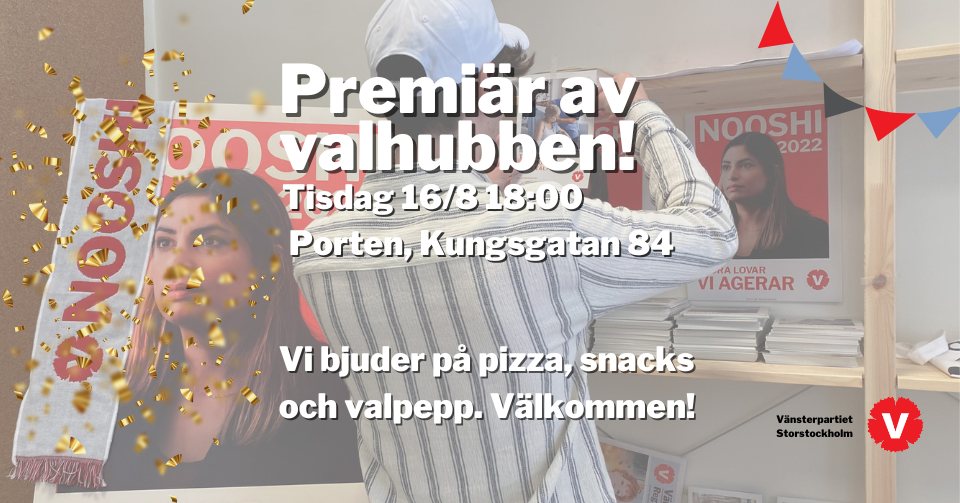 Valhubben kommer att fungera som uppsamlingsplats för valarbetare, volontärer, aktivister, sympatisörer, nyfikna, partimedlemmar, väljare med flera som tillsammans organiserar oss inför valet 2022. Valhubben kommer även att fungera som uppsamlingsplats för aktuellt valmaterial. Allt från flyers och affischer till ballongmaskiner, merch, Nooshi som pappfigur mm.